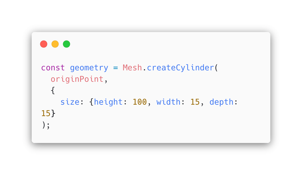 To create the cylinders I used the Mesh geometry which gives us more flexibility in visualization (for example I can use color gradients or custom materials). However, one drawback is that it doesn’t scale well with a large number of features because generating the geometry is an expensive process. Mesh has utilities to create the most common shapes like cubes or cylinders: