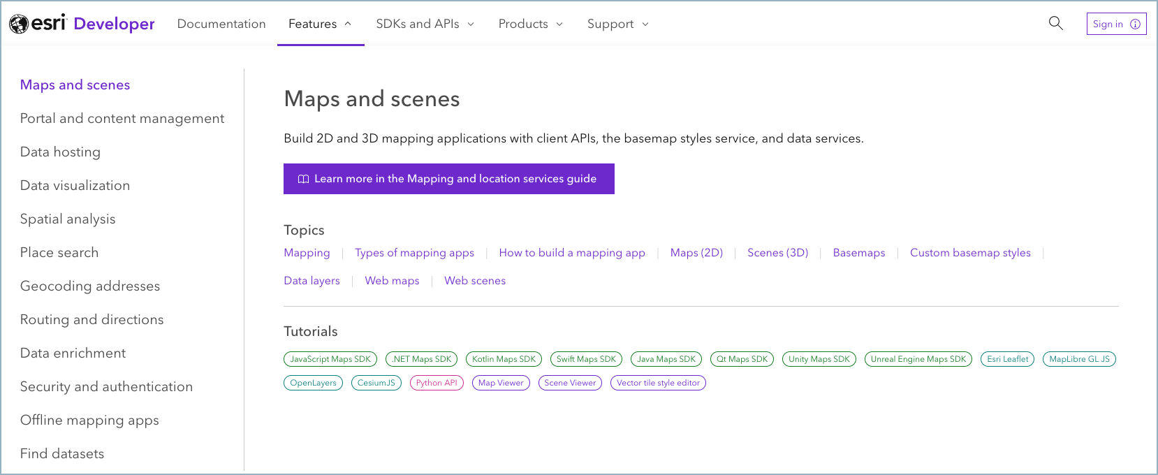 The new top-level navigation menu provides quick access to developer guides, SDKs and APIs documentation, as well as developer product and support information. The Features menu gives you direct access to key guides, topics, tutorials, code examples, and samples – no matter where they are located.