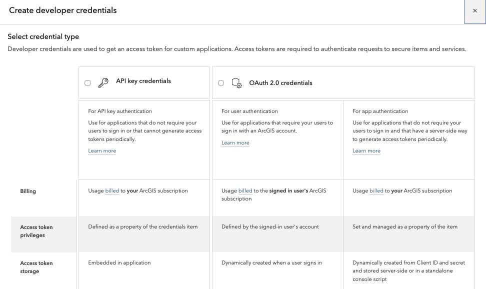 Developers with an ArcGIS Online and ArcGIS Location Platform account now have to go to your portal at arcgis.com where we have enhanced the experience to create and manage developer credentials for your applications. API keys now offer greater functionality and control to access ArcGIS services and portal.
