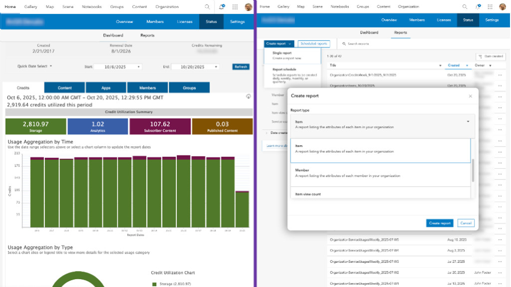 - ArcGIS Online > Manage subscription > View and report status.