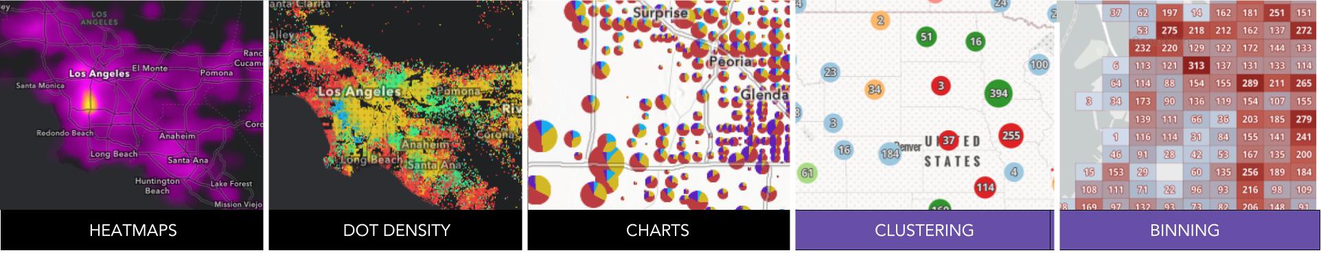 Aggregated data renderers like clustering and binning are optimized for visualizing high-density datasets. They rely on server-side geospatial statistics to summarize feature concentrations and spatial patterns. This is only possible with feature services, since the server has access to the full feature geometries rather than simplified or tiled representations, allowing for accurate aggregation and realistic distribution patterns.