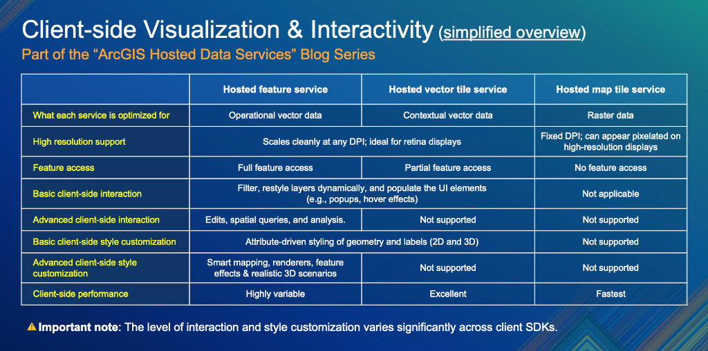 Also note that both vector tile and feature services use WebGL or OpenGL for efficient client-side rendering when used with Esri SDKs. Unlike map tile services, their performance also depends on the client device’s hardware.