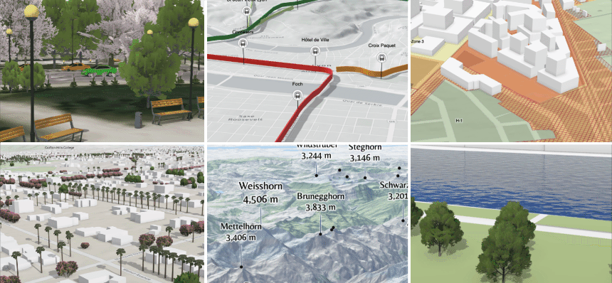 If you’re working in 3D, you can create semi-realistic 3D scenes by rendering lines and polygons as either flat or volumetric shapes (e.g., realistic animated water). Point features can also use 3D models, including custom GLTF assets, Web Style Symbols, and heatmaps.
