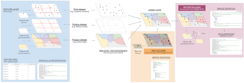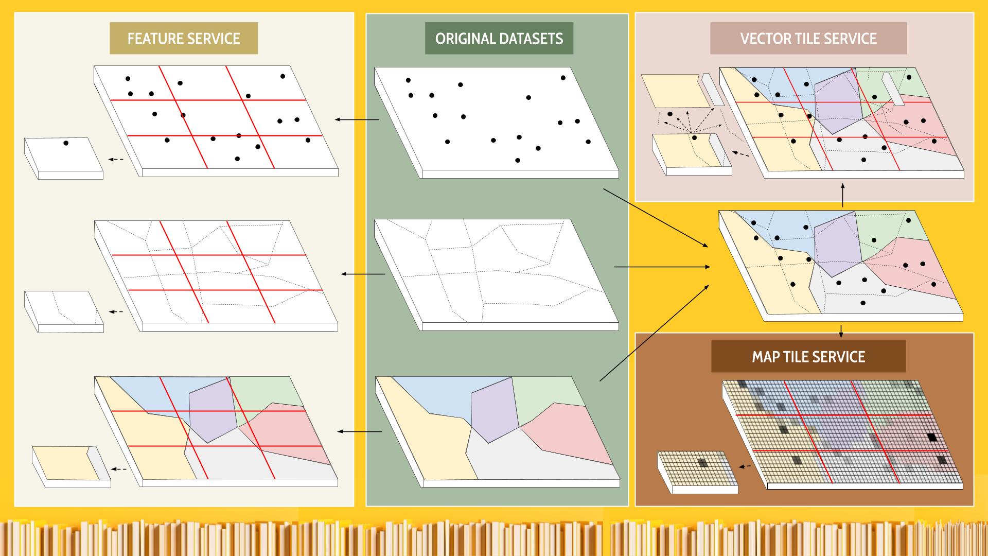 - Hosted vector tile services: for large geospatial data that doesn’t change frequently, supporting customization and basic interaction