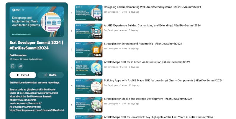 If you follow us on X or watch our livestreams, you probably know that more than 160 technical sessions from the Esri Developer Summit 2024 were published in the Esri Developer Summit 2024 gallery at the end of April.
