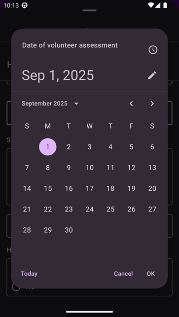 - Date of volunteer assessment: A date and time picker that allows users to select a date and time for their visit. When the user taps the field, a date and time picker appears.
