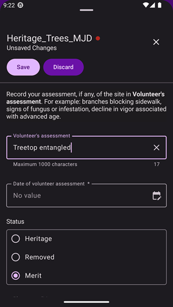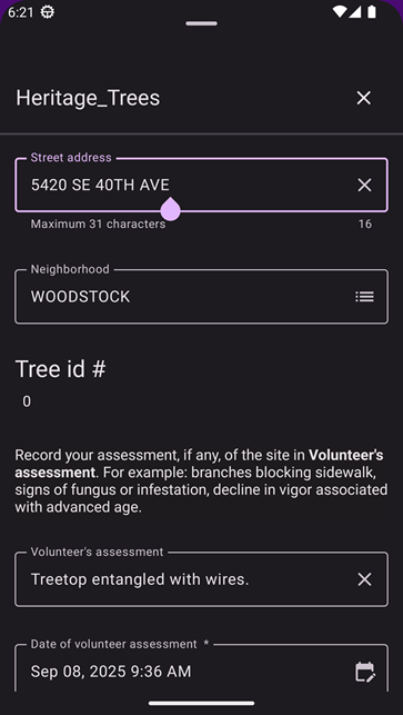 - Status: Radio buttons that allows users to select the official recognition status of the tree: Heritage, Removed, or Merit.