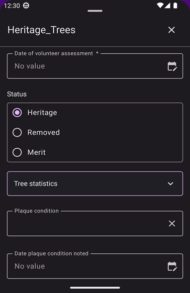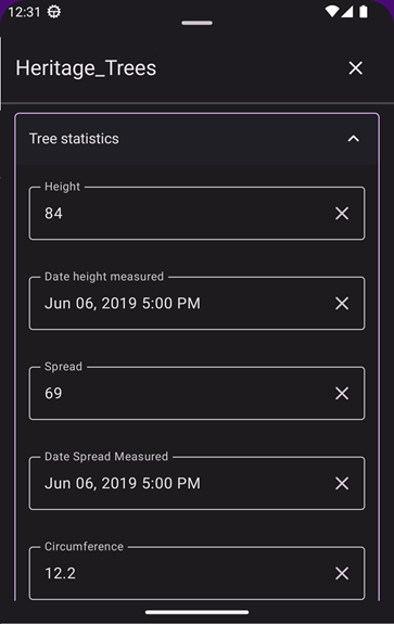 - Tree statistics: A collapsed group element that contains multiple related fields, including the tree’s height, spread, and circumference. The group element can be expanded by tapping the chevron icon to the right of the title.