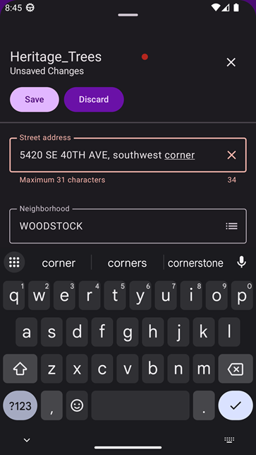Another feature that comes with feature forms from the toolkit is real-time input validation. If the user enters a value that violates the validation rules, an error message immediately appears next to the field. For example, in the dataset schema, the Street address field is defined with a maximum length of 31 characters. When the user taps in the field, the constraint “Maximum 31 characters” automatically appears below the field.