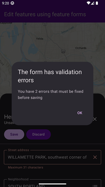 - If there are errors on the feature form, the default validation errors dialog appears. The edits are not saved to local storage on the device.