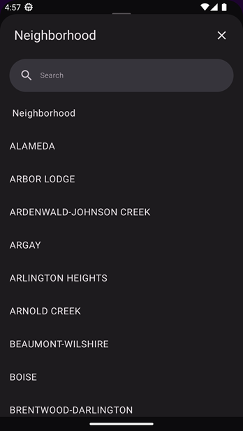 - Neighborhood: A dropdown list that allows users to select from a predefined set of options. When the user taps on the Neighborhood field, the Neighborhood list appears, occupying the entire vertical space if the list is long, as it is here.