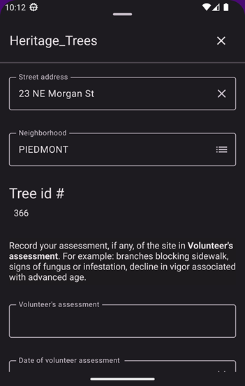 Let’s take a brief tour of a feature form suitable for your Trees for All app. The form’s layout, color scheme, and typography are consistent with UI elements on a mobile device. The feature form displays, typically in a bottom sheet, when the user taps a feature on the map.