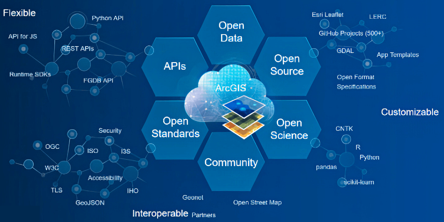Esri’s Open Vision Initiative, established in 2015, exemplifies our dedication to maintaining ArcGIS as an open and interoperable system. This commitment encompasses our support for open source technologies, open specifications, open standards, and open data. Throughout recent years, we have initiated numerous open source projects, actively participated in third-party endeavors, and integrated open source solutions into many of our product offerings.