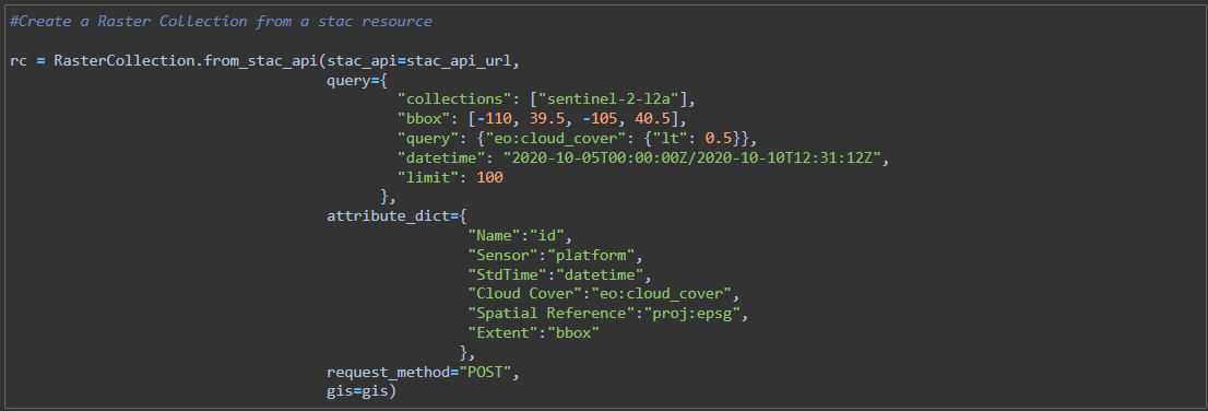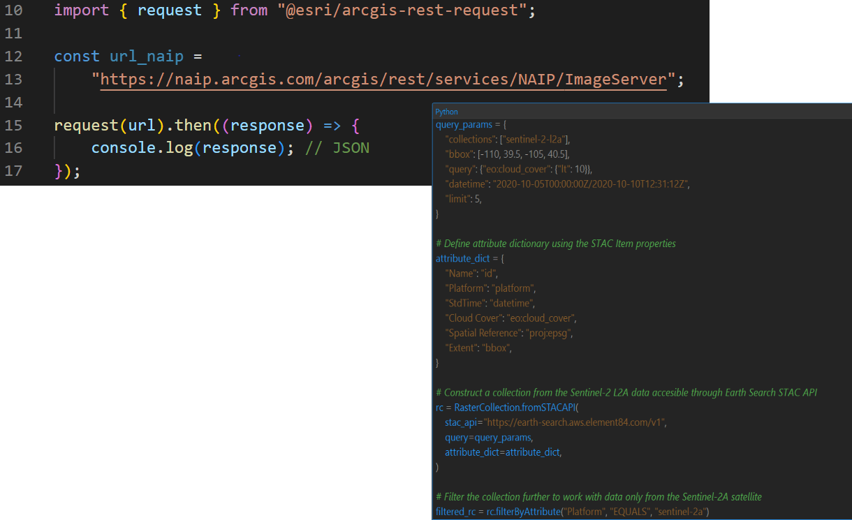 In a traditional desktop or web client, tools can be used to search or discover data that adheres to specific requirements. Think about only viewing images with less than 10% cloud cover, from a specific sensor platform, that were collected on a specific date in time. Accessing data with a code-first approach allows us to define a query that ensures the returned data meets these conditions. This can also be extended to the confines of an area of interest. All with a few lines of code!