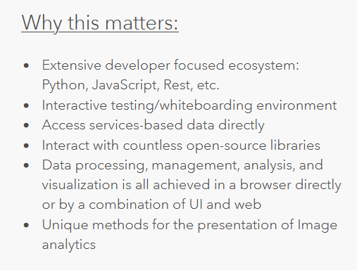 Both the ArcGIS API for Python and ArcPy can be utilized within ArcGIS Notebooks or through standalone code as well. ArcGIS Notebooks provide a Jupyter notebook experience across ArcGIS. In addition, many tools are exposed through the ArcGIS REST APIs providing a powerful experience for working with Image Services. The geospatial developer can leverage these environments in creative ways to create analytical products through unique combinations of tools. This really provides interactive environments for testing and quickly analyzing data in a connected environment through ArcGIS Pro, ArcGIS Online, or ArcGIS Enterprise. What makes this approach unique is that it can be performed at the Desktop client or within a browser!
