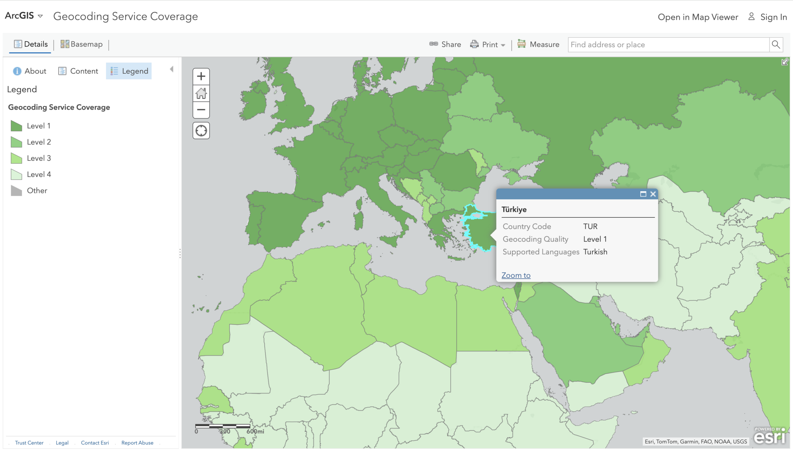 For Level 4 countries without adequate data coverage, the geocoding service still supports address matching to populated areas and well-known points of interest. As more data becomes available for level 4 countries, whether through authoritative data sources or user community contributions, they could get re-classified as Level 3 or 2 countries, thereby improving the geocoding performance during address searches.