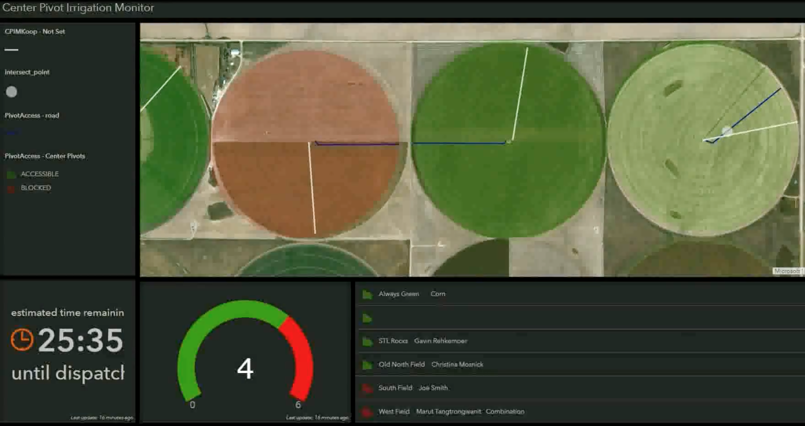 Using an API provided by the center pivot irrigation boom and turn that into a Feature Service (using Esri Koop) that can be consumed in the platform. As part of our application we’ll utilize the ArcGIS Platform (Operations Dashboard, Web AppBuilder, Portal) to visualize the information in ways that will allow customers to see the data in an easy-to-consume way. We will use ArcGIS GeoEvent Server to send alerts to the employees when the booms block or unblock a service road.