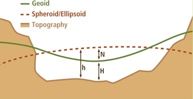 In the illustration above, the green line represents the geoid surface. It gently curves to follow the topography. The dashed line represents the surface of the ellipsoid. The h is the height above the ellipsoid (HAE). In this case, height is a negative value. Geoid undulation, N, is the distance between the spheroid and geoid surface. The orthometric height, H, is related to the ellipsoid height by the following:
