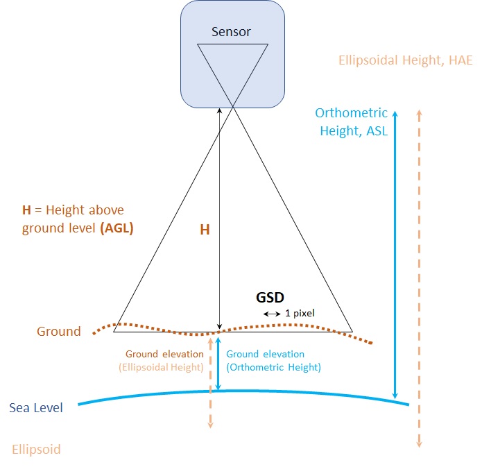 - Ellipsoidal height — This case is rarely requested but may come up with some clients who choose to work in a separate, custom vertical system. Ellipsoidal height is the native measurement made by GPS, but in most cases, GPS values are translated to orthometric height. If you have GPS data from a surveyor (for example, for ground control points), you’ll want to verify if it is expressed as ellipsoidal or orthometric height.