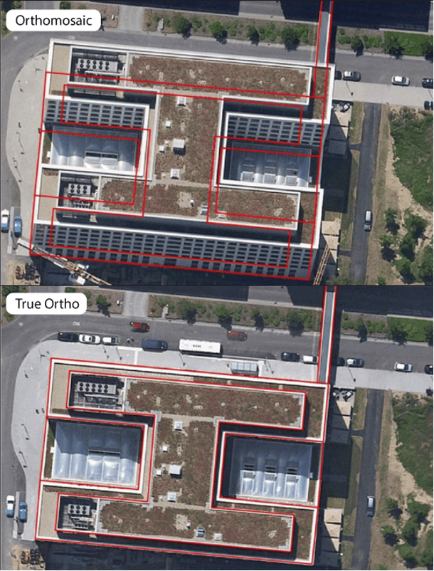 An example of a true ortho is shown directly below, in the lower of the two images. The top image shows an area from an orthomosaic created by traditional methods, resulting in horizontal layover of the building, and making it appear to lean away from the camera, with building facades visible. The red lines show the actual location for the building footprint—and in the bottom image you can see the excellent alignment between the building footprint polygon and the image after processing, creating a true ortho (building facades are no longer shown).