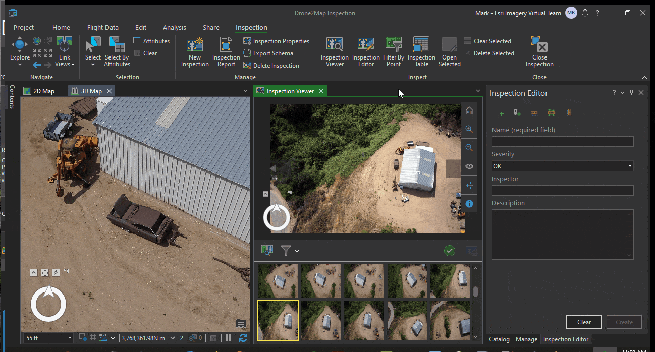 Since drones can reach areas that are difficult or dangerous for field crews, drone images are being used in many industries for inspection of assets. Now you can create an inspection workspace for any project and use the new inspection workflow to efficiently view multiple images for any object or region of interest in your project area. Inspections can be done in 3D, allowing you to mark points or polygons directly on the source images, and create 3D features for each observation. The inspection features are captured in a new feature class, and can be overlaid on 3D objects and referenced between all viewing that location.