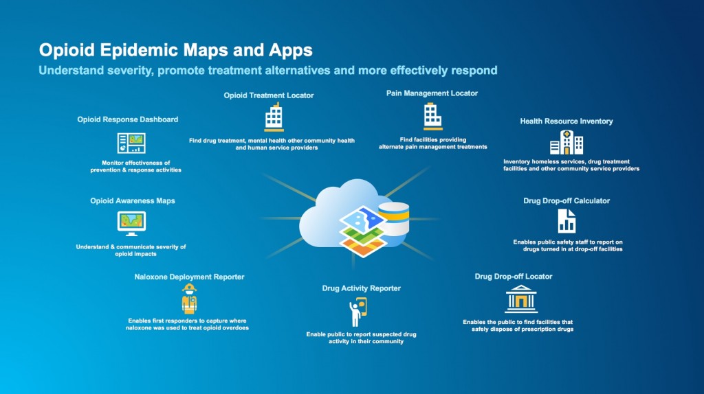 Opioid Epidemic maps and apps help communities combat opioid addiction. This collection includes 9 new Solution Products: