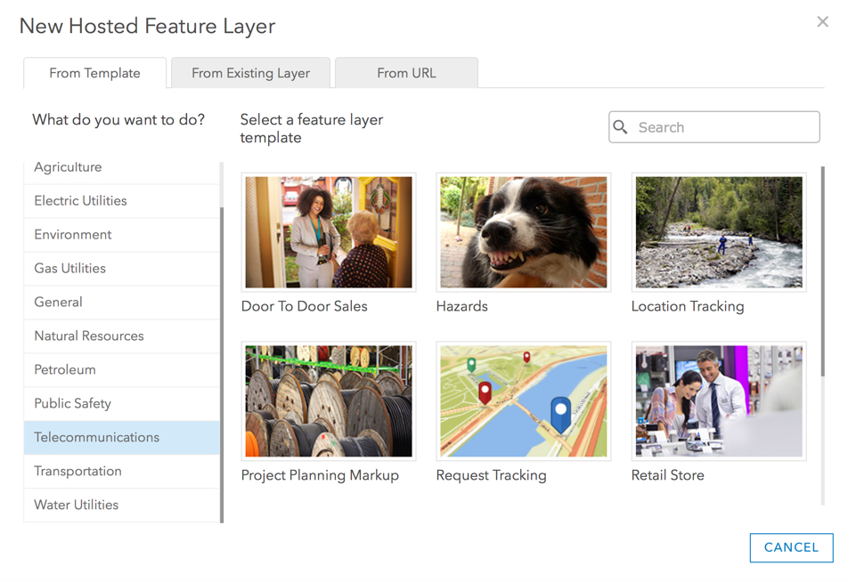 To simplify deployment of ArcGIS for Electric, Gas, Telecommunications and Water 3 Layer Catalogs were published and 35 Feature Layer Templates were added to ArcGIS Online.