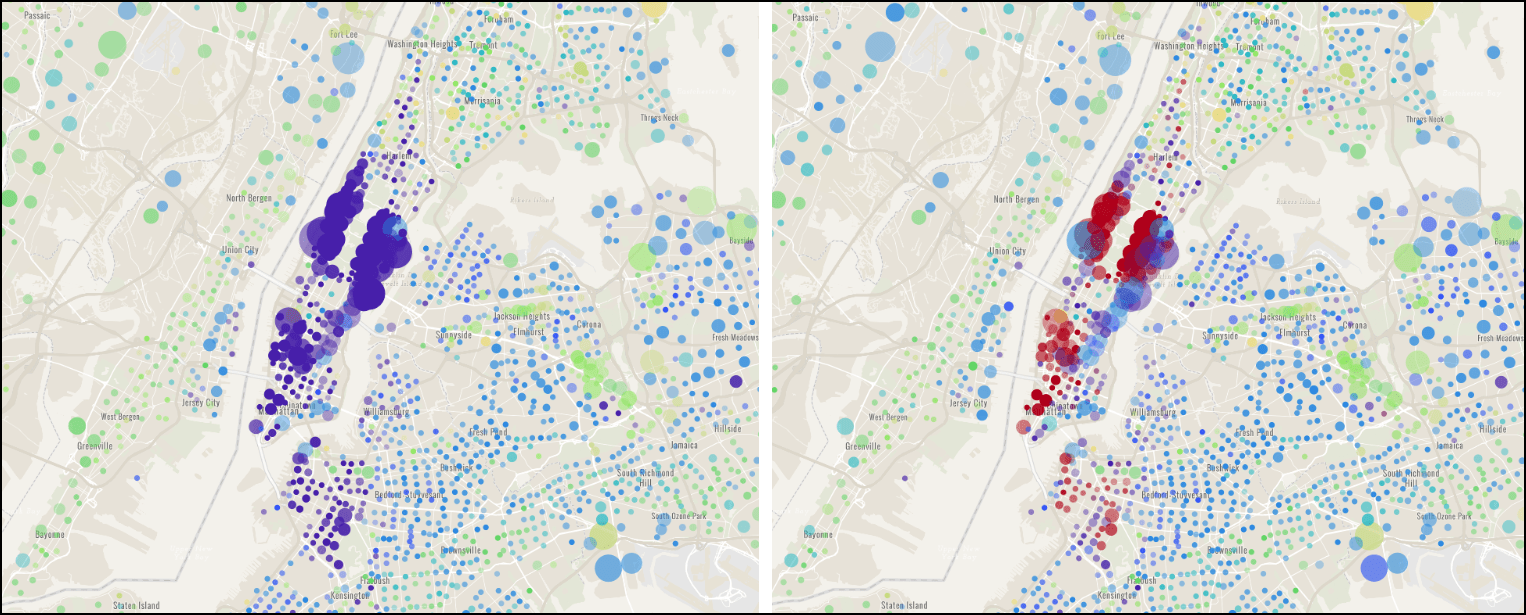 One of the best ways to show you the impact of these new data ranges is with a map. Esri’s US demographics team created the 2017-2018 Home Value Comparison web map for the Manhattan, New York area using ArcGIS Online’s smart mapping technique called Predominance Mapping.