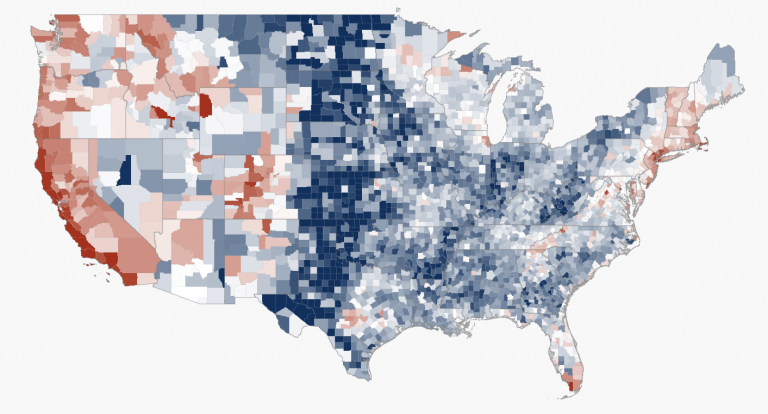 An index greater than 100 references areas where homes are affordable. An HAI less than 100 indicates areas where homes are less affordable and where median income is not high enough to purchase a median valued home. The map below shows the HAI by county, highlighting the spatial distribution of housing affordability. Darker blue areas represent higher housing affordability, while darker red areas represent lower affordability when indexed to the US average of 124.