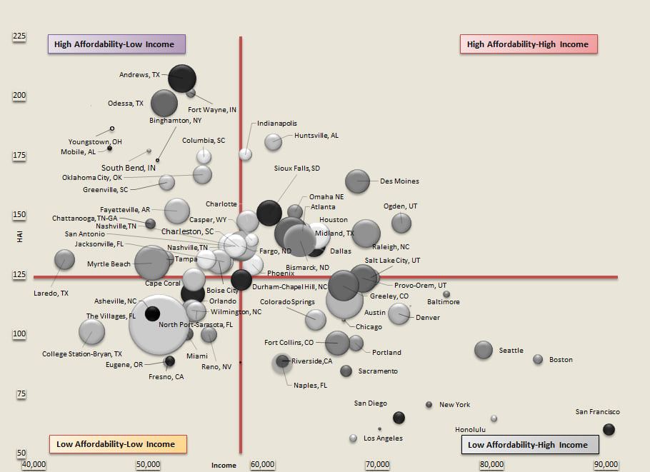 Major metropolitan areas in the bubble chart below use 2018 median household income and the 2018 HAI as the axes, or $58,100 and 124, respectively. The four quadrants thus represent different categories of income and housing affordability. The bubble size represents household growth from 2010-2018.