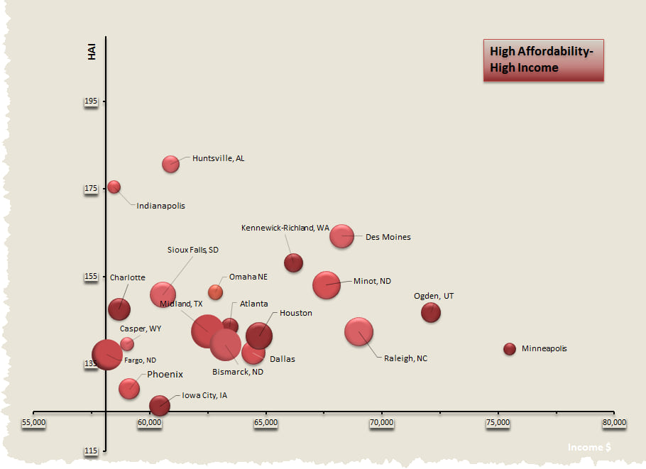 Unsurprisingly, growth has slowed in the traditionally expensive urban areas of California and the Northeast. Some of the highest growth rates have been in the South and Mountain West. Where should one move to get both affordable housing and a high income? Potential destinations include: