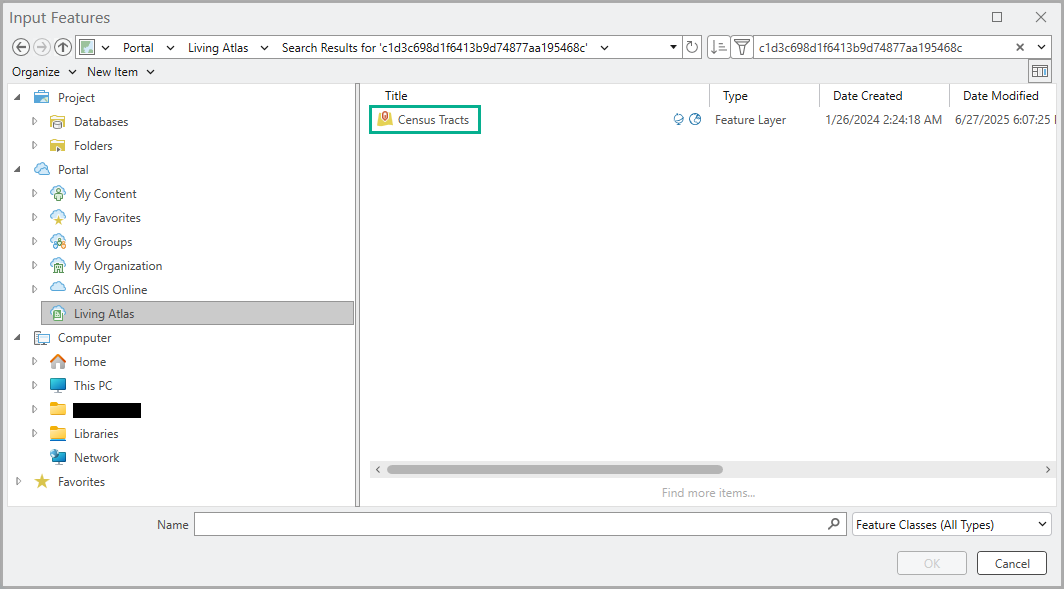 Click Input Features and browse to the Living Atlas option. Let’s use the Census Tracts feature layer. This feature layer was created by the Esri account Esri _Federal_Data, which registers content of interest from the U.S. federal data community. Either scroll to the Census Tracts result or enter a search term to find the feature layer.