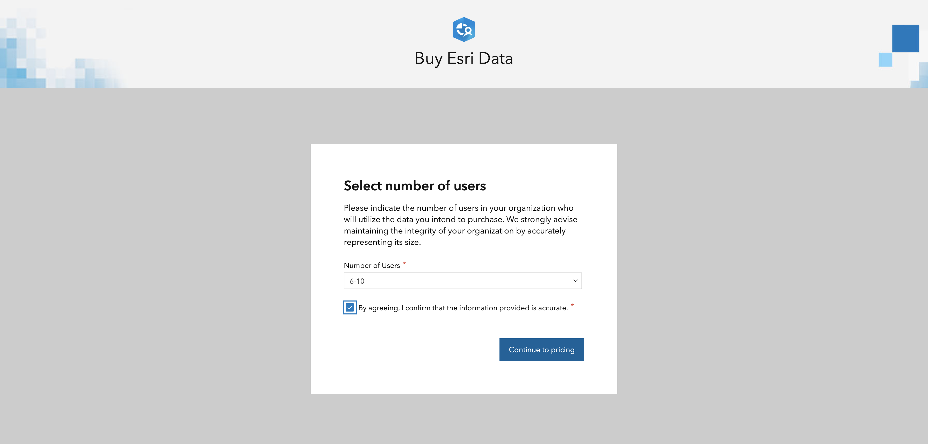 Next, proceed to pricing by clicking the blue button in the top right-hand corner. Enter the number of users in your organization, and click the check box to confirm that your information is accurate.