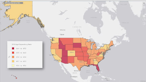 The Age Dependency ratios measure the ratio of children and seniors, to the working age population and are available for 2019 and 2024. Children are defined as population aged 0-17. Seniors are defined as population aged 65 and over. The working age population is defined as population aged 18-64.