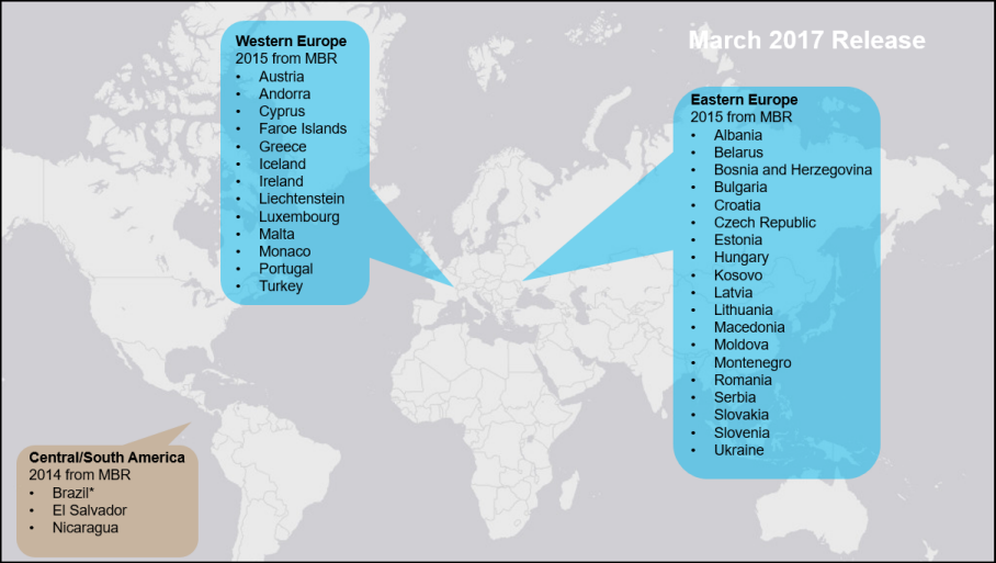 Thirty-two (32) countries in Europe and two (2) countries in Central and South America have been updated with more recent demographic data from MB Research (MBR).
