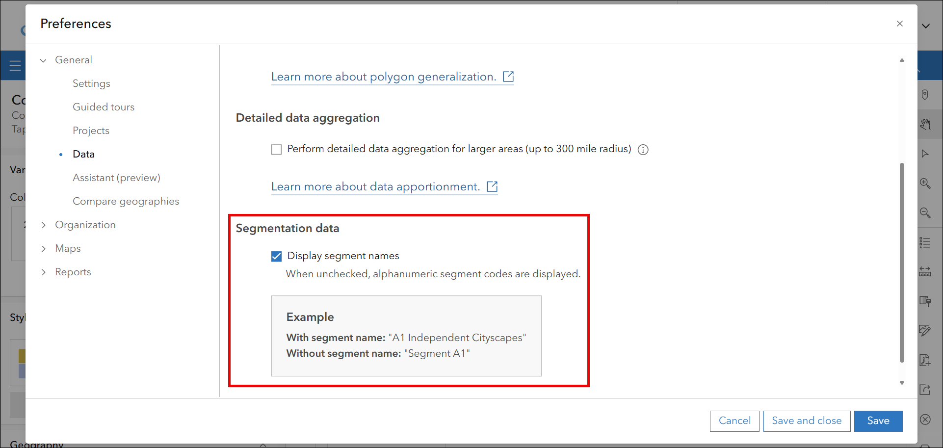 Additionally, when working with Tapestry data in ArcGIS Business Analyst Pro and ArcGIS Business Analyst Web App, you now have the option to display either segment names or alphanumeric codes. This allows you to choose how you want to interact with the data. For example, working with codes can make it easier to search, filter, and integrate Tapestry with other datasets, especially in technical workflows in which concise identifiers are more efficient.