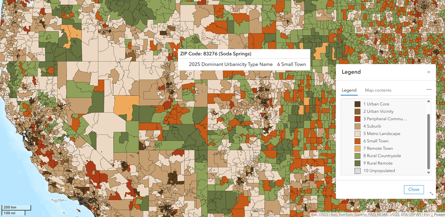 In November 2024, Esri released a new urbanicity classification system as an enhancement and replacement for the six Urbanization groups used in the last system. The Esri Urbanicity Type dataset designates land into 1 of 10 categories that share characteristics used to classify urbanicity, including density, distance, and socioeconomic dependence on urban cores.