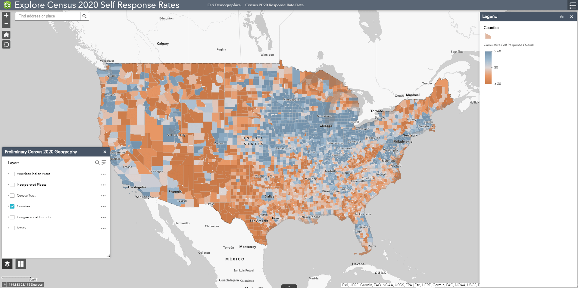 To help aid in these efforts Esri is hosting six layers, updated daily from the Census API with Census 2020 Self-Response Rates in preliminary Census 2020 geography:
