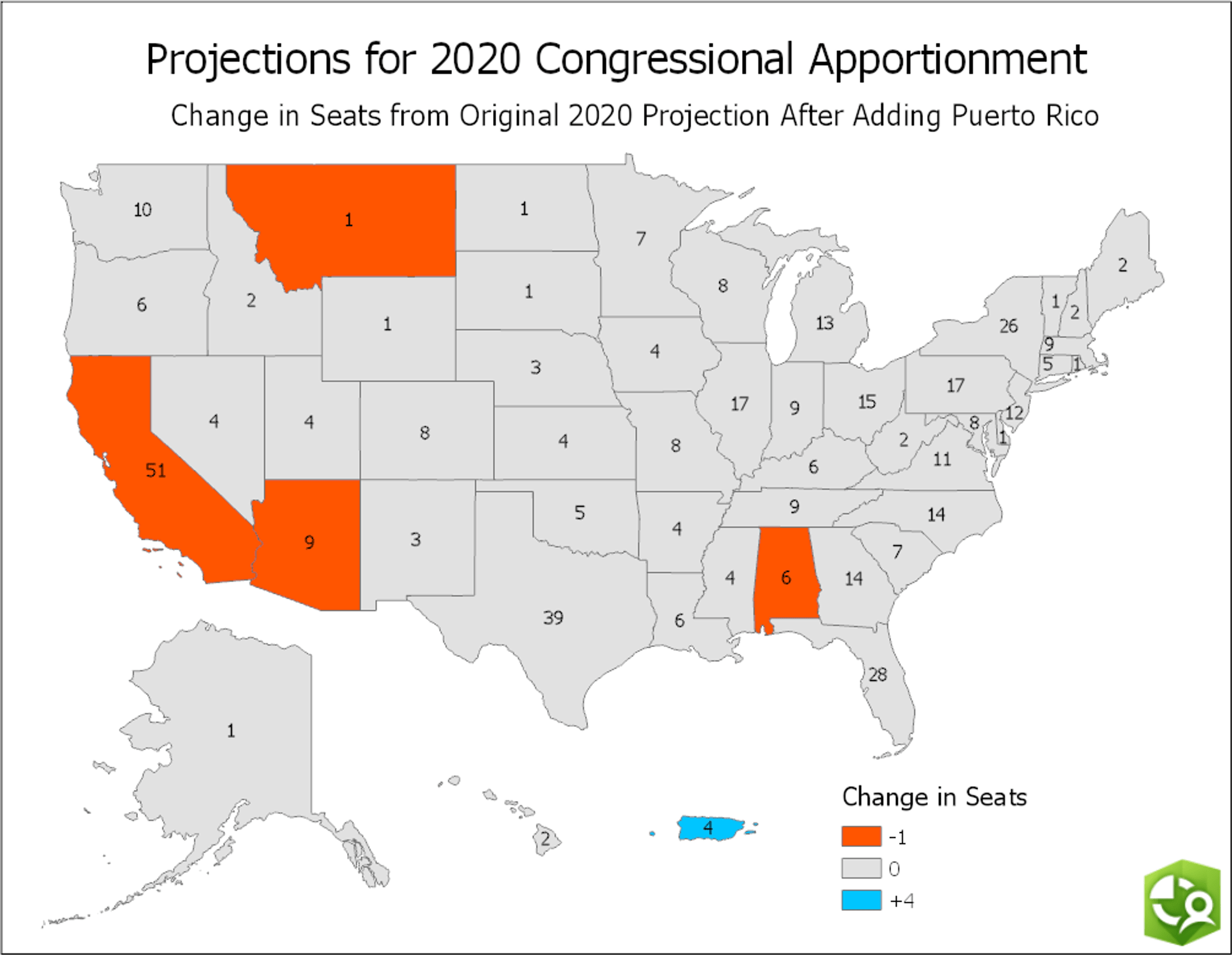 For Puerto Rico, Vintage 2018 estimates from the Census Bureau are projected to 2020 using the same method as the Esri state population data and included into the reapportionment calculations along with Esri’s 2020 state population projections. The changes from the original 2020 projection as a result of the inclusion of Puerto Rico are illustrated in the map below.