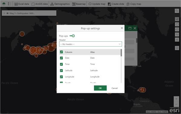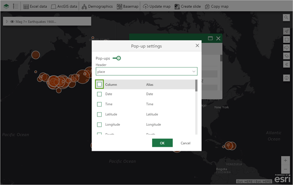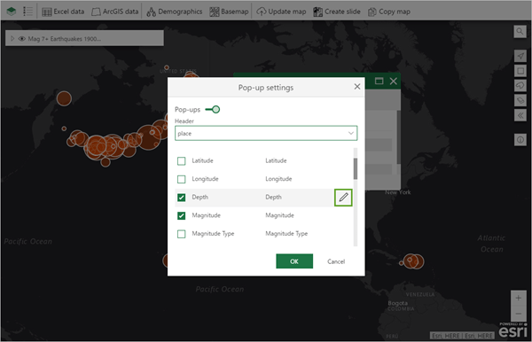 I can now choose specific attributes to include in the pop-up. I check the Date, Depth, and Magnitude boxes to include them in the table. These are the most useful and important details that a user may want to know about an earthquake. I already provided layer and map titles that make it clear that the symbols on the map represent earthquakes, so I won’t include that information again in the pop-up.