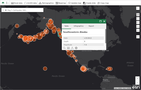 Let’s go through an example. Using an Excel table containing open source data on earthquakes, I created this map in ArcGIS for Office: