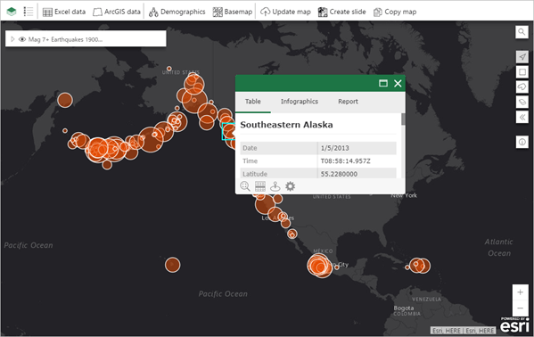 With this map, you can explore earthquakes of magnitude 7 and higher in North America. Each symbol on the map represents an earthquake, and the points are styled by size so that earthquakes with higher magnitude have larger symbols.