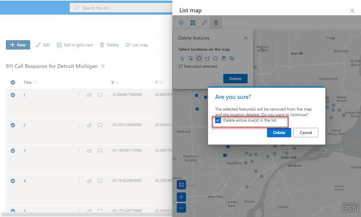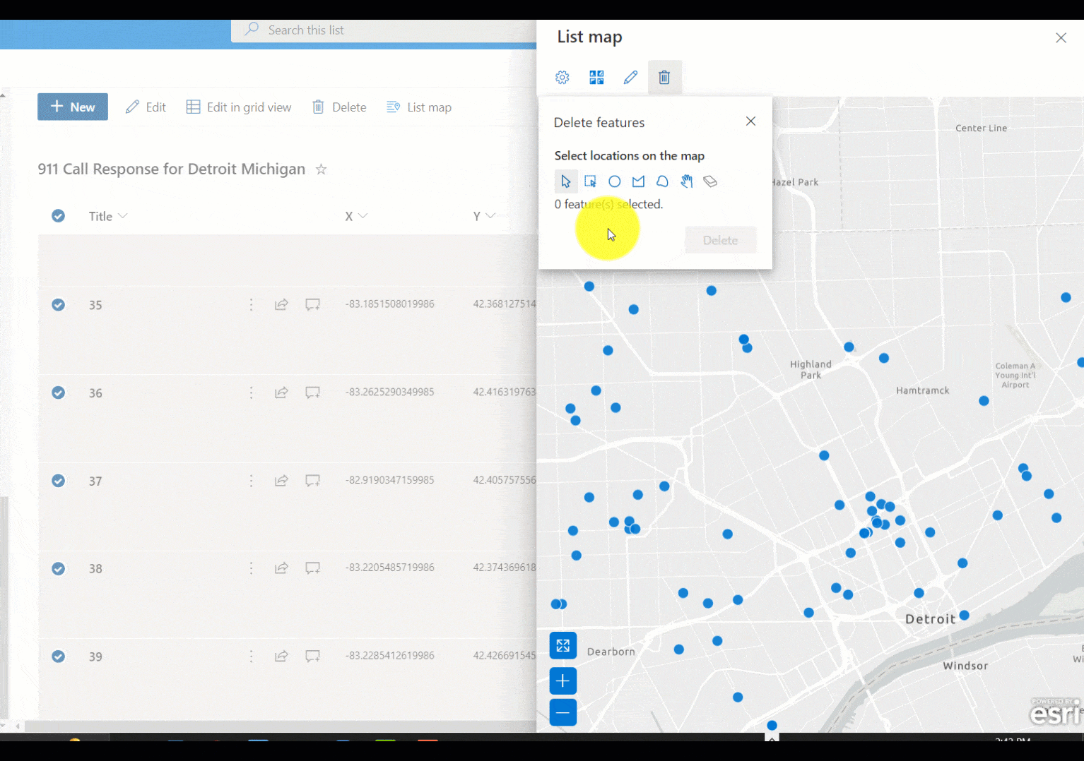 The 911 Call response data for Detroit, Michigan is displayed as point features on the List Map. To edit any point locations, click on the edit tool and then select only one point on the map. The point can then be moved to any location, and/or coordinates can be edited directly in the edit window.