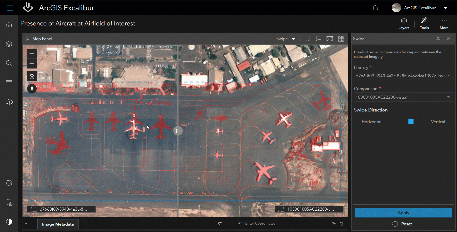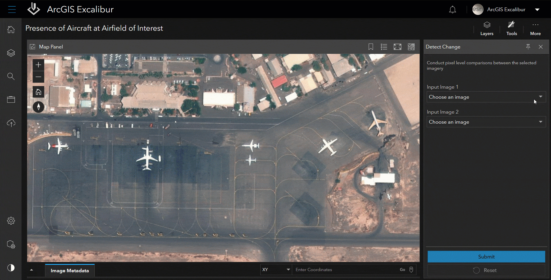 ArcGIS Excalibur is a web-based image analysis app that allows users to access, analyze and share imagery for informed decision-making. Excalibur streamlines visual analysis through comparison tools that make it easy to find differences in imagery that can match up to activity change in an area of interest such as missing or moved objects at an airfield or port.