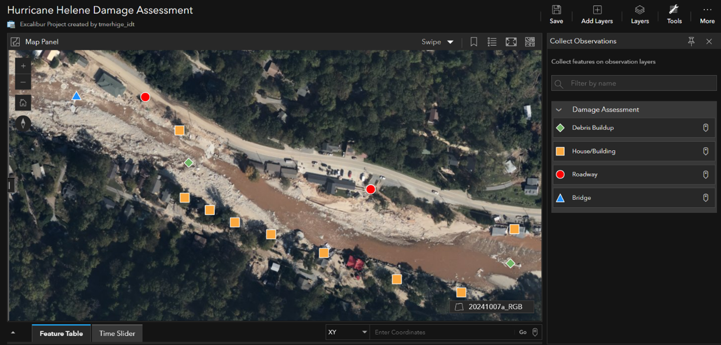 Our next goal was to utilize ArcGIS Excalibur for the damage assessment. Excalibur can be used with imagery, video, or live stream services to identify points of interest such as potential roadblocks, locations where people may still be trapped, and critical infrastructure. At this point, we loaded imagery of the region and began our analysis of the data.