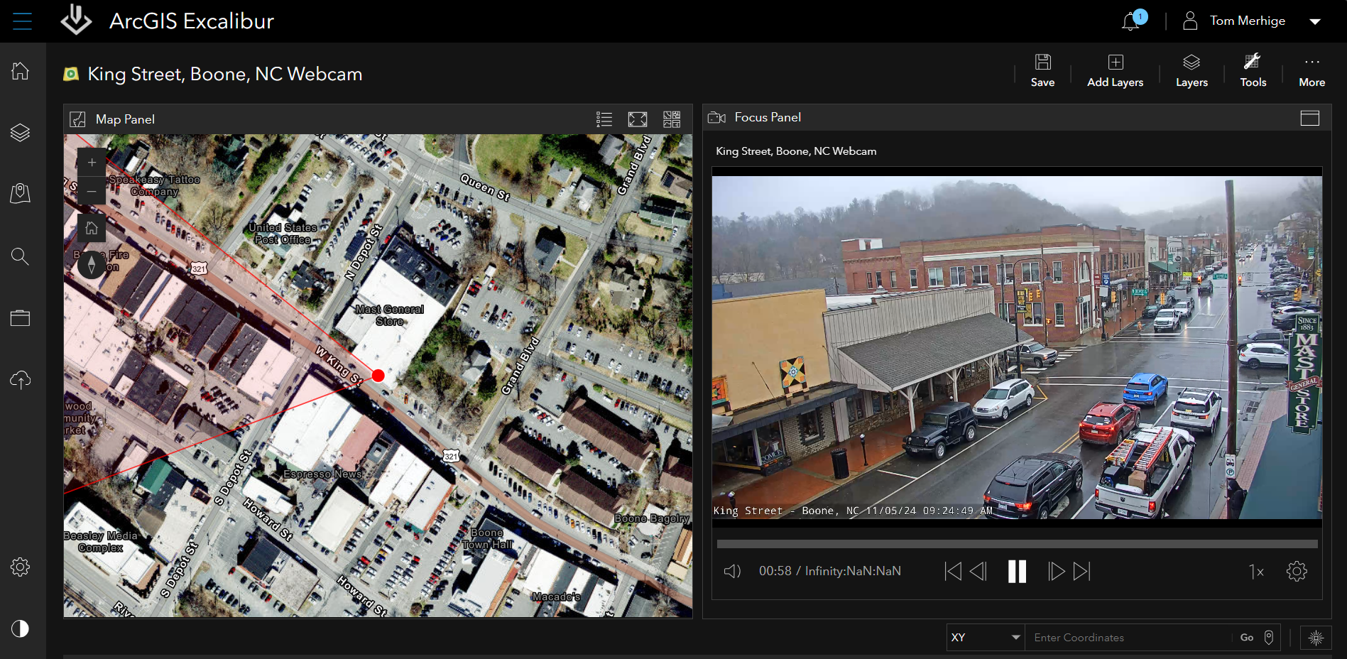 Another concern during this period was that additional storms could lead to further flooding and damage. Using the video services we had created previously from livestreams around Western North Carolina, we were able to continuously monitor the status of the area over the course of the storm and point out locations that may need urgent attention. Additionally, the live stream provided a real-time portrayal of the severity of flooding in specific locations, as well as which areas were less impacted. Thanks to ArcGIS Video Server’s ability to utilize spatial metadata, we could instantly target and map specific points of interest within our field of view to investigate further.