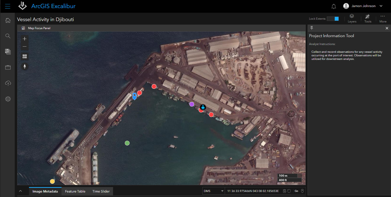 With a single click, a user can access an imagery project, a dynamic way to organize resources to complete an image-based task. The imagery project contains a set of instructions that provide details of what the user is being asked to perform. In our example below, upon opening the project, we can see that the instructions require us to collect and record observations for any vessel activity occurring at a port of interest in the vicinity of a specific geocoordinate (11 36 33.975466N 043 08 02.185653E).