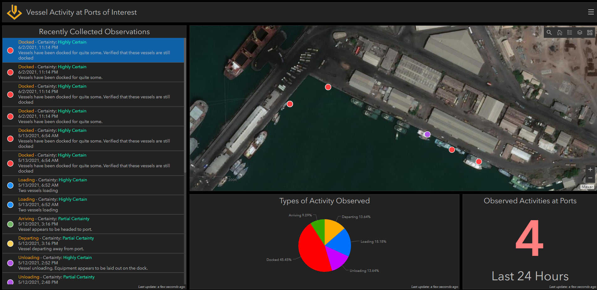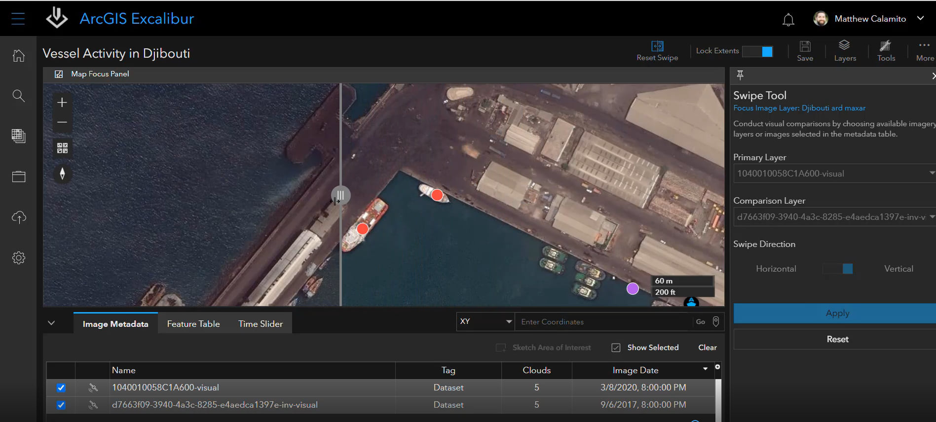 Prior to reporting on existing observations, we can use the Swipe Tool to compare images to identify changes that may or may not have occurred. In this example, using previously collected imagery, we observed two vessels. The most recent imagery below confirms that those two vessels remained docked.
