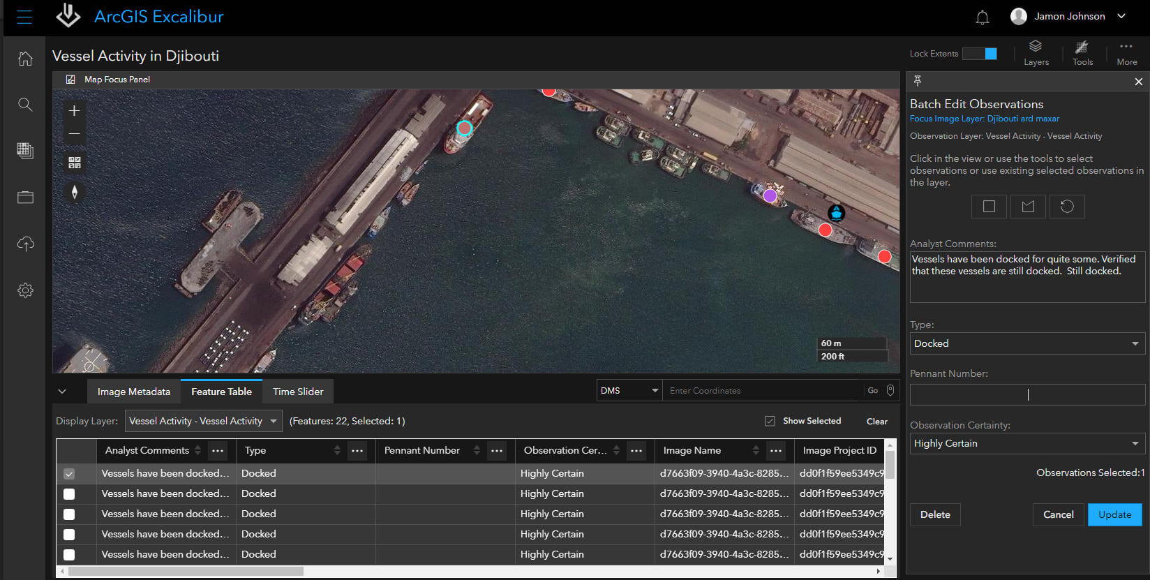 The Copy Observation Tool, added in the May release, enables a user to copy previously collected observations as new observations. This creates an exact clone where all image metadata and analyst information from the underlying image is updated within the feature, as depicted below. From here, we can quickly update these observations with a few comments by using the Batch Edit tool. In this instance, we will add a brief comment that the vessels are still observed as being docked.