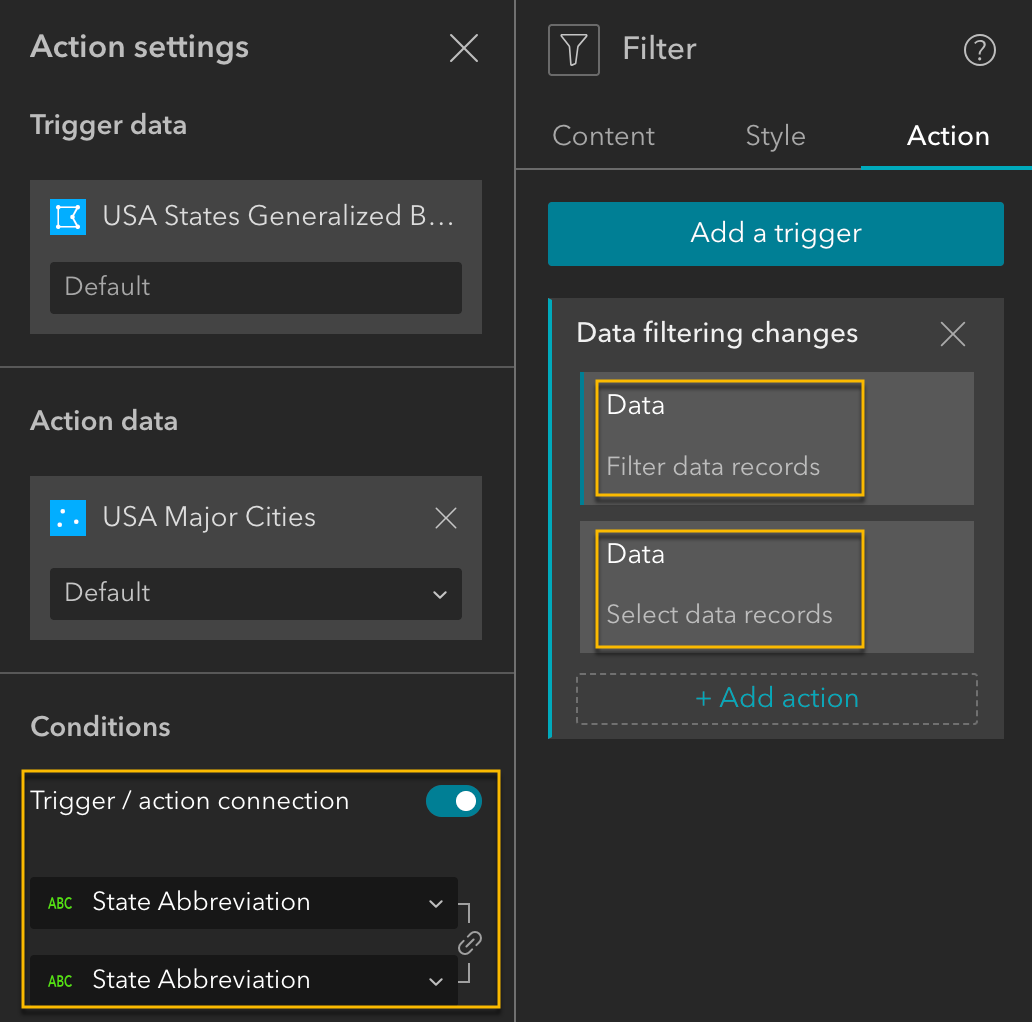 Previously, when the Data filtering changes message was triggered, the only available actions were Zoom to and Pan to. In this release, we’ve expanded the capabilities by adding Filter data records and Select data records actions in response to this message. This enhancement allows widgets such as Map, List, Search, and Table to interact with data more intuitively.